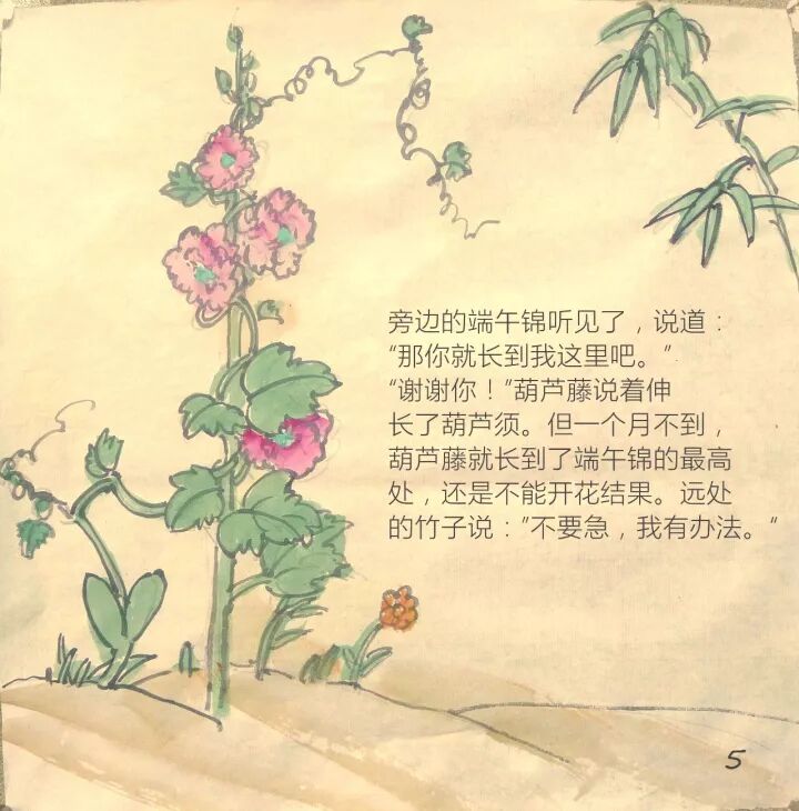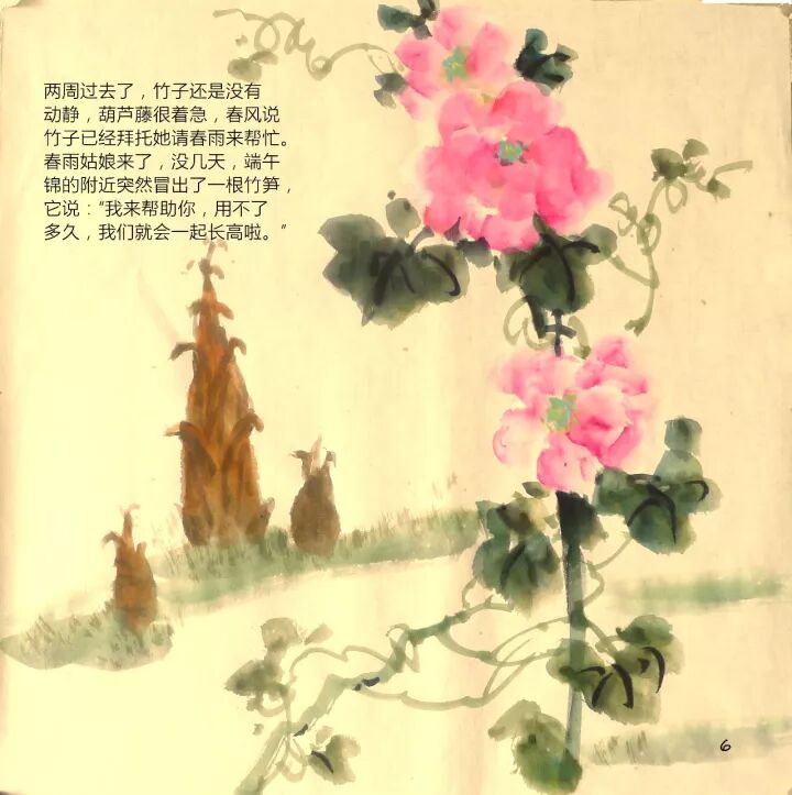 葫芦藤低头看竹笋,疑惑地说:“你那么低,能助我长高吗?”竹笋一听笑裂了嘴:“你看见竹子了吗?那是我妈妈,让我来帮助你,我们也可以长那么高。”这才知道,原来竹子把竹鞭埋在土里,伸到自己旁边,等春雨到来,长了竹笋破土而出。夏天,葫芦藤长长的藤蔓爬满竹子,开满了星星点点白色小花。