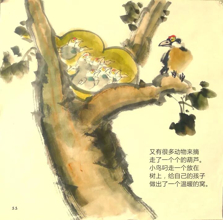 小鸟叼走一个放在树上,给自己的孩子做出了一个温暖的窝。又有很多动物来摘走了一个个的葫芦。大家都感激它,葫芦藤感动了,摇摆着它的藤蔓,向周围植物致谢。小草微微地摇着自己的身体,端午锦也绽放出花朵,它们都替葫芦藤感到高兴。