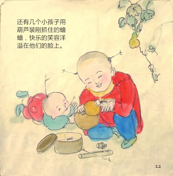 野外来了一群孩子,有的抓蜻蜓,有的捉蝴蝶,看见葫芦更加高兴,说,这下不愁没盒子了。他们用葫芦装刚抓住的蛐蛐,快乐的笑容洋溢在他们的脸上。