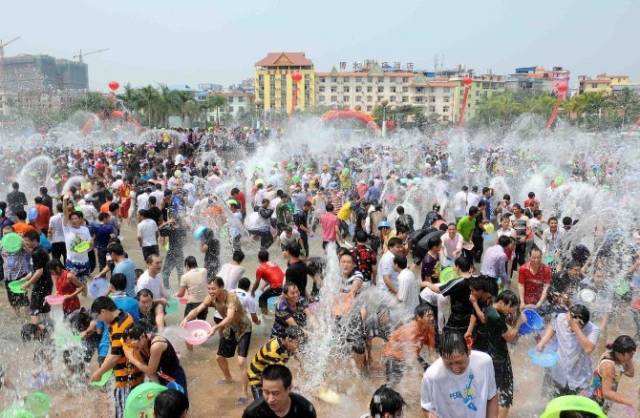 俗语说:“水花放,傣家狂”,在傣家风俗里,这一天你可以尽情的朝别人身上泼水,被泼的越多越厉害,说明越受欢迎。 帅哥的周围,常常围着一圈“泼”妇,美丽的姑娘,一定被“水手”簇拥。走在小巷里,也要当心本地人在阳台发动的“空袭”,碰到那些服装统一的正规军,赶紧让开吧,他们多半是全村出动,被他们盯上,可不是变成落汤鸡那么简单。