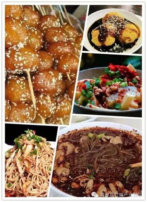 彭州军屯锅盔、彭州九尺板鸭、双流老妈兔头、一根面、伤心凉粉、蒸蒸糕、棒棒鸡、凉拌兔丁……