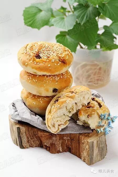 每个面卷竖起来按扁后擀成小圆饼醒发20分钟,配料中的白糖加水搅拌至融化,小圆饼表面刷一层糖水,撒入适量白芝麻。