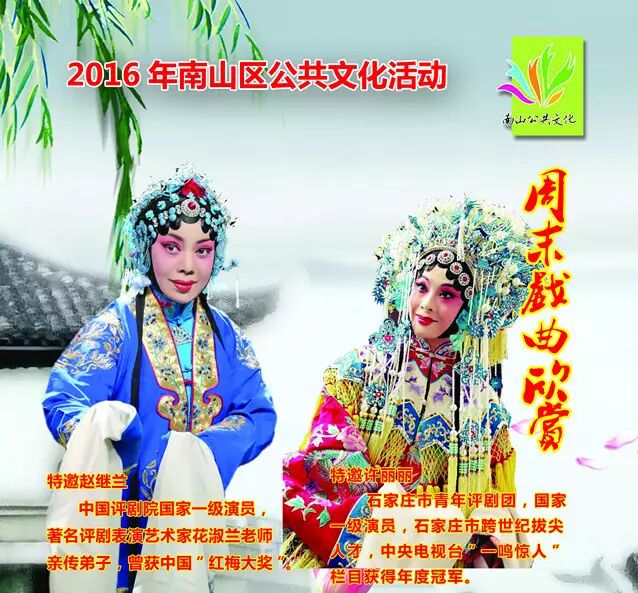 ●南山区“周末戏曲欣赏”系列活动,是南山区委宣传部(文体局)近年来成功打造的具有特色的公益文化活动品牌,以“传承戏曲经典,弘扬中华传统文化”为宗旨,6年里举办了179场高水平演出,在全国范围内组织京剧、越剧、豫剧、黄梅戏、秦腔、花鼓戏、评剧、汉剧等戏种的当红中青年名家领衔主演。