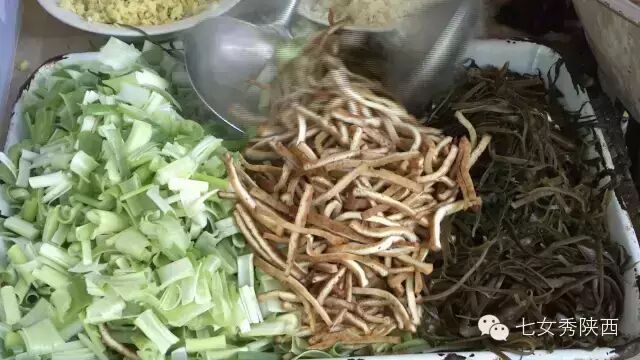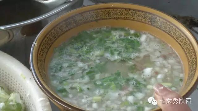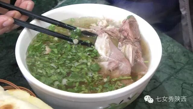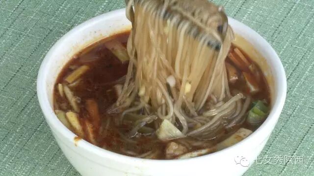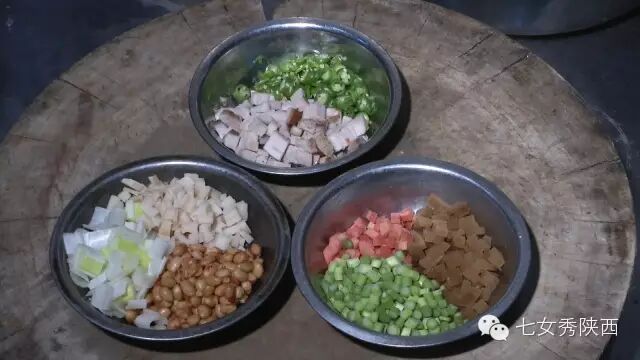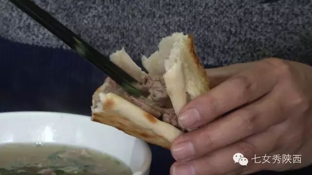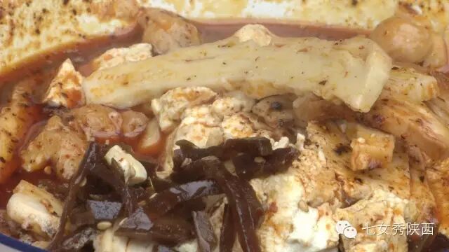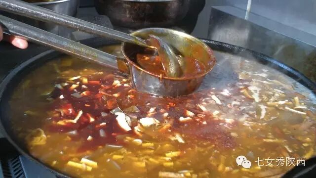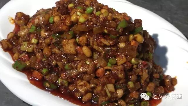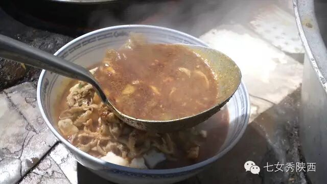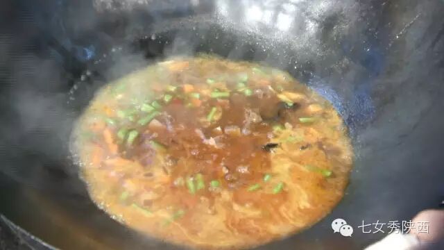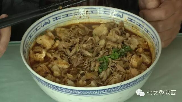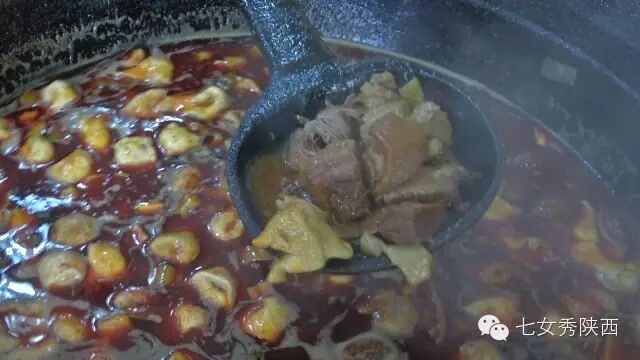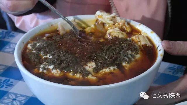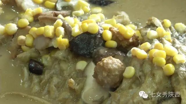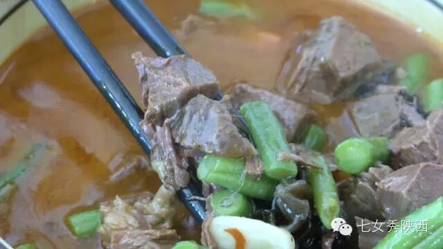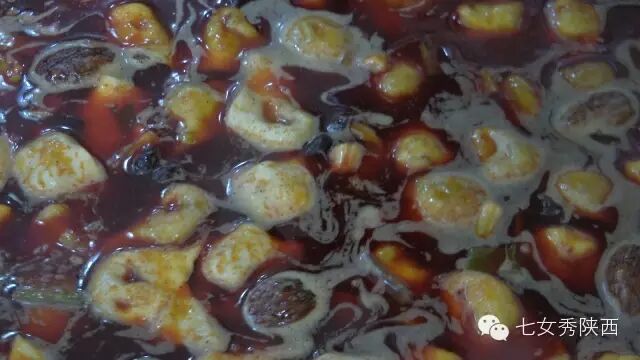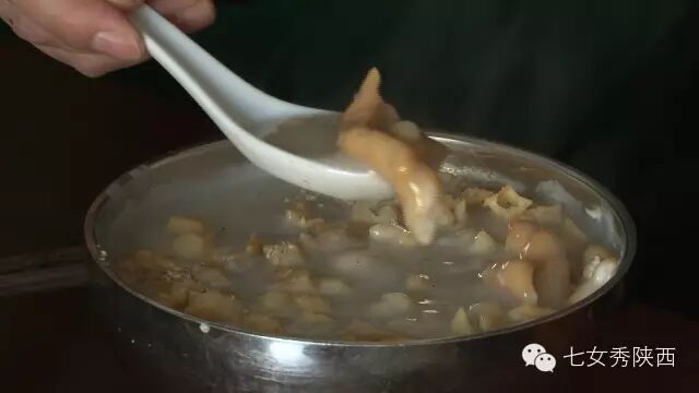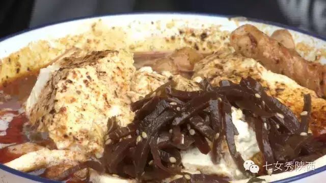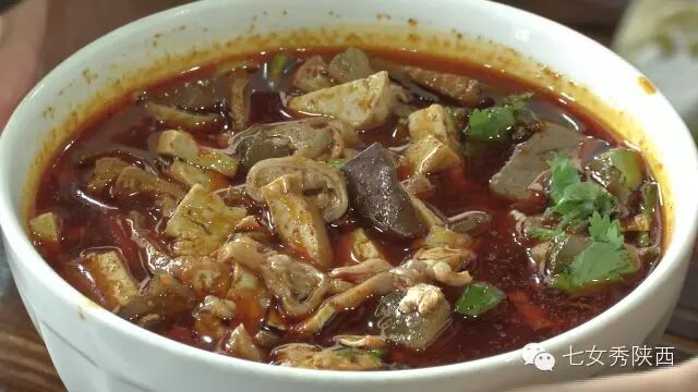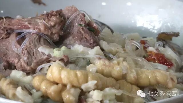 烧开后加入凉粉,最后加入红油,一锅红油油热腾腾的麦子泡就做好了。 紧靠黄河的大荔,盛产鲤鱼,当地厨师就地取材,用黄河鲤鱼做出一道泡馍。吃完鱼肉再煮馍,把烙好的饼子切碎,下进汤锅里,下面文火慢炖。 到了蒲城,面辣子、八宝辣子与椽头馍的组合,也算泡馍的一个变种。 所谓八宝,是肉丁、青椒、莲菜、葱花、黄豆、蒜薹、胡萝卜和咸菜丁,八种食材荤素搭配,色彩丰富,把它们按照炒熟难易先后下锅,最后用大量的红辣椒披上外衣,一盘颗颗粒粒、鲜红香辣的八宝辣子便盛装亮相。吃的时候,既可以用椽头馍夹上八宝辣子,也可以把馍泡进面辣子,八宝辣子则变成一道热菜。 各式各类的泡馍,是物质匮乏年代的遗产,主料总归是馍,肉汤只是为了让它回软,增加油香,其实,还有简单的办法可以达到这样的目的,关中十分普遍的油茶便是其中之一。 关中的泡馍,种类繁多,花样无穷,馍、肉、汤或者辅料中任何一个角色的变化,都能带来新的口感和味道。就地取材、丰简随意的广泛适应力,让它们渗进关中人的一日三餐。泡馍的融合汇聚、传承创新,正是关中精神的所在。《七女秀陕西》播出时间:陕西一套,每周一至周日下午17:20分