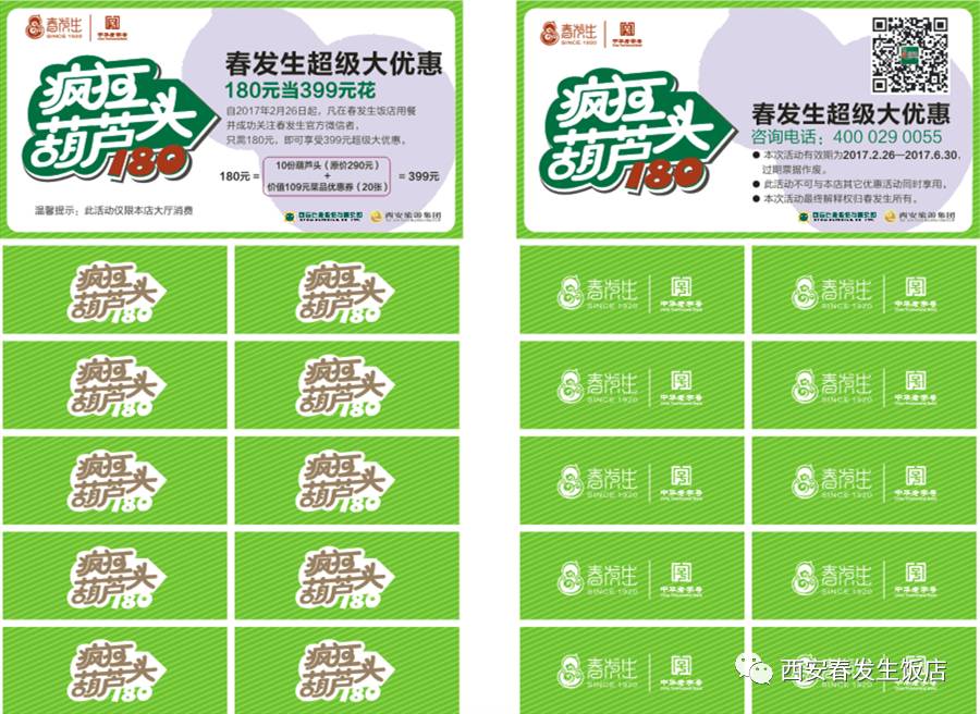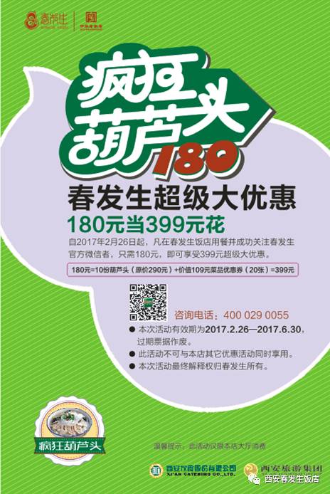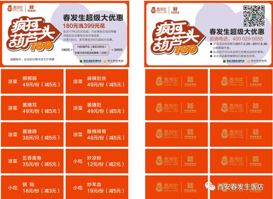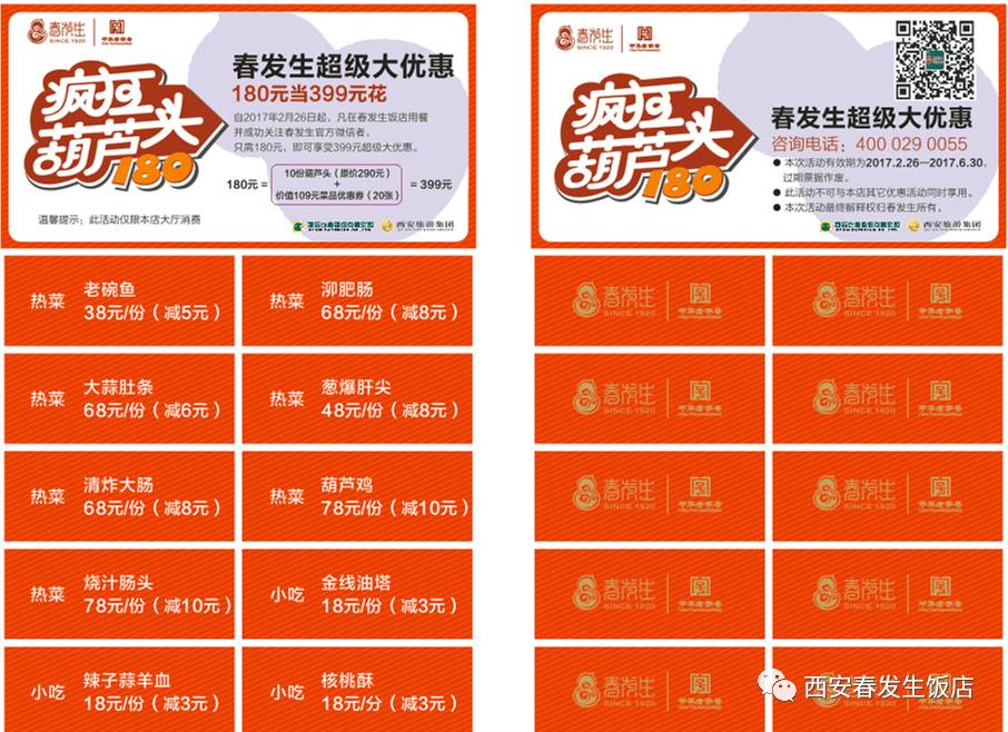 1、凡在春发生店内消费,并成功关注西安春发生饭店的顾客,只需180元,即可享受399元超级大优惠。