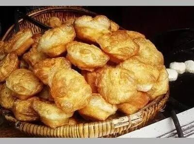 油馍头别名叫面托或老鸹头,炸至金黄色的油馍头和胡辣汤是郑州早餐的黄金搭档。