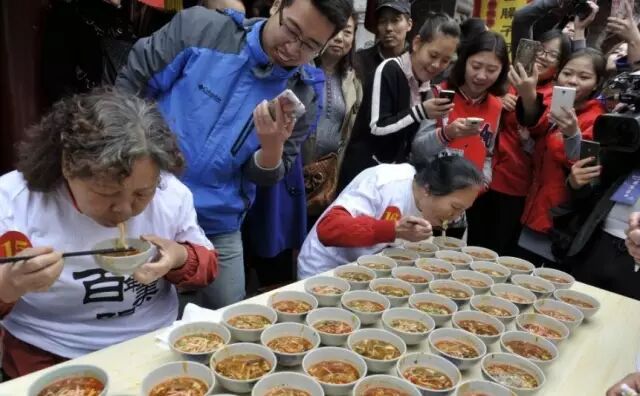 随着一声令下,他们争先恐后地吃了起来,有的年轻小伙为了拼速度,已全然顾不上形象,甚至站起身来,一碗接一碗地将面条送入口中,鼻头上沾满了红色的辣子油,白色上衣也溅上了油点,但这些都不能阻止参与者的吃面热情。