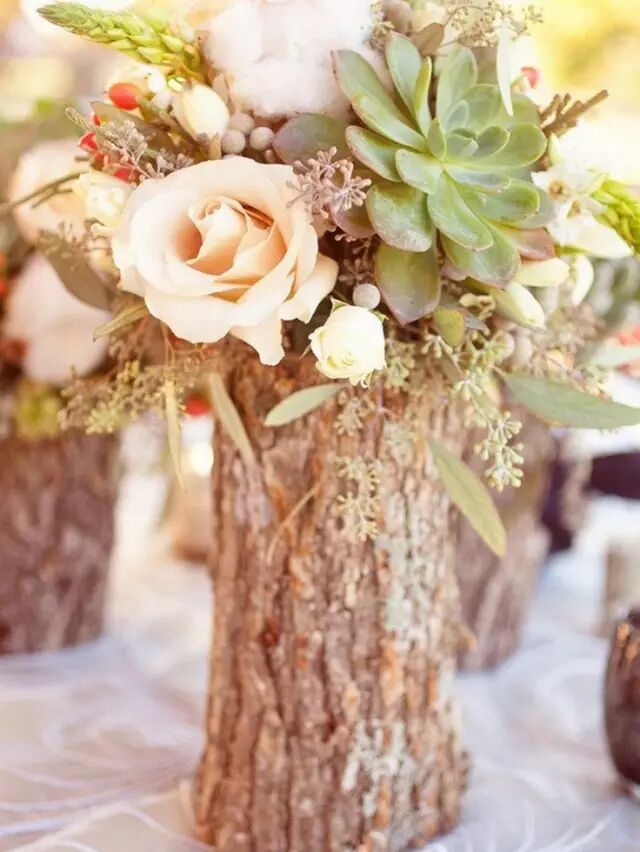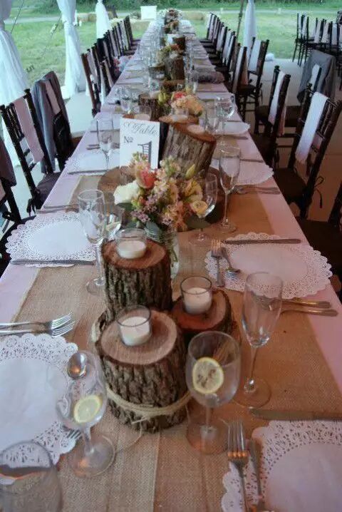 既然都可以用作新式的蛋糕台,小木桩自然也适于出现在餐桌上作装饰,你可以用它放置鲜花,也可以用它作摆放桌号牌与菜单的工具。