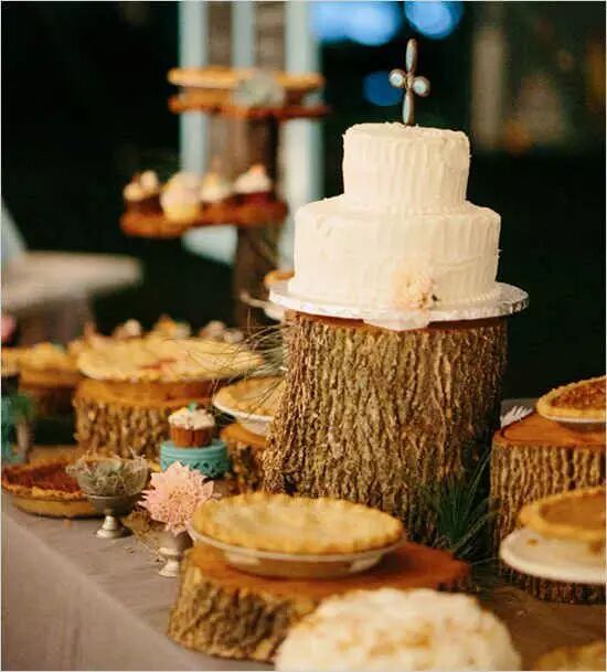 还有一种很火的小木桩装饰方法是用作甜品台或蛋糕台,为婚宴平添一份清新的色彩。