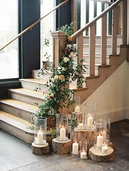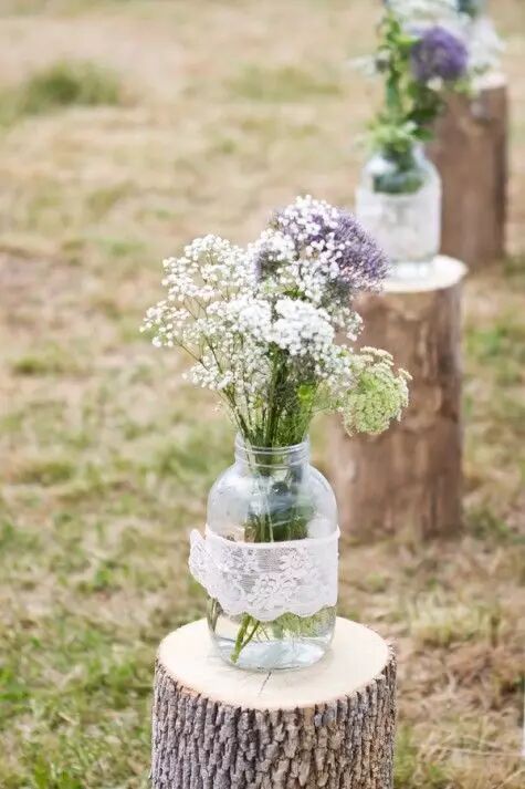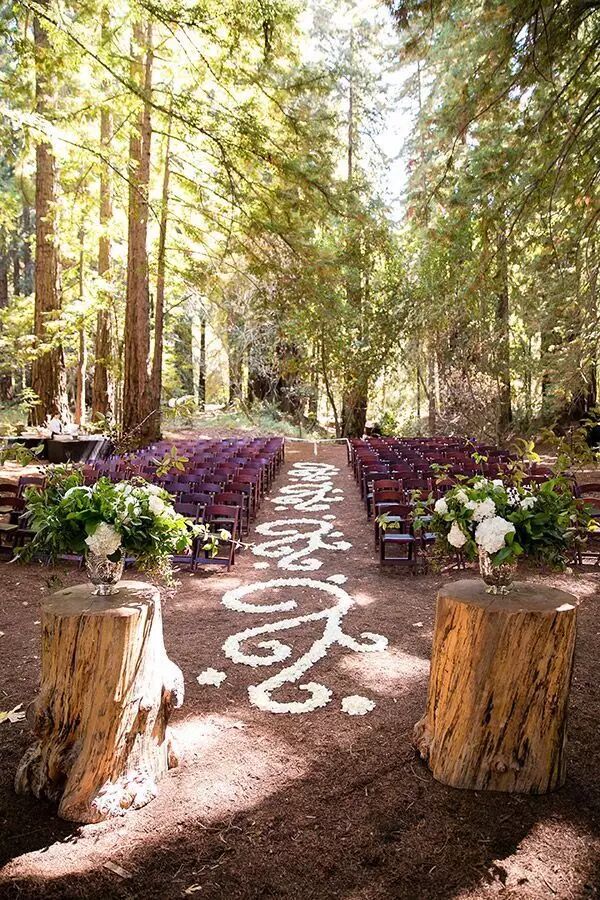 最常见的方法,是用作路引以及仪式过道的装饰,为了更显质感,你可以在小木桩上放置鲜花或蜡烛。