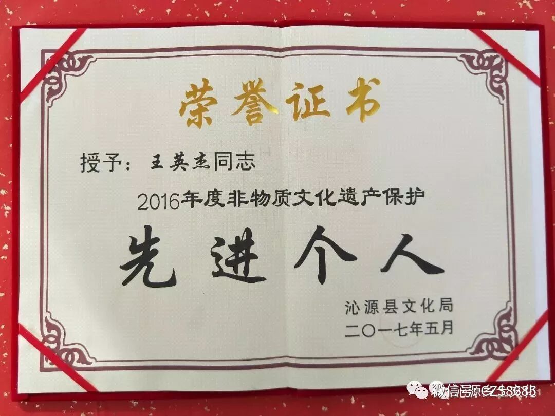 王英杰,男,1975年出生,沁源县交口乡官军村人,出生在一个普通的农民家庭,患有先天性腿部残疾。他从生下来就几乎没有离开过土炕,凭着自己顽强的毅力,勤学苦练,苦苦追寻着自己的艺术梦。在吸收借鉴中国画的创作技法基础上,对传统的烫画工艺进行了挖掘和整理,渐渐形成了自己的艺术风格。2013年,他的葫芦烫画传统工艺被成功列入第三批市级非物质文化遗产。2014年被市残联评选为长治市市级自强模范。