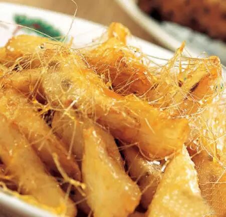 到鲁菜馆吃饭,除了吃九转大肠、糖醋鲤鱼等主菜外,最后的甜品往往是拔丝菜肴。山东十大名吃之一便是这道济南拔丝山药了。