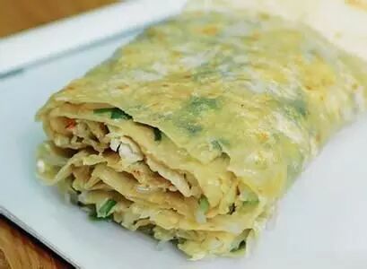枣庄菜煎饼以鲁南地区煎饼为主料,配以各种蔬菜煎烤而成。枣庄菜煎饼五色俱美,六味飘香,老少兼宜,俗称“鲁南热狗、汉堡包”。