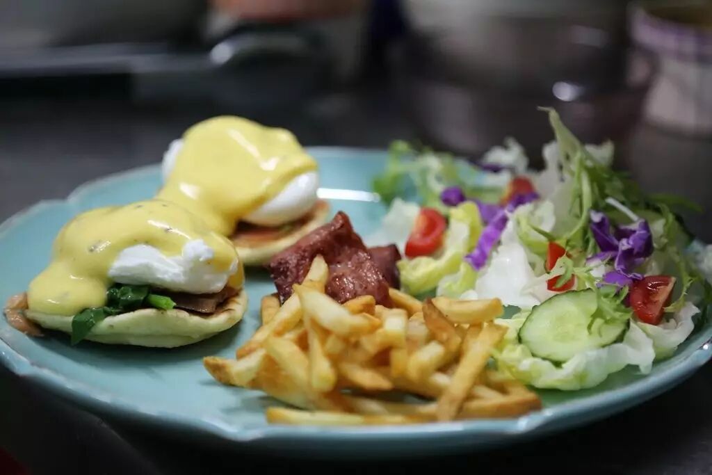 这个班尼迪克蛋有烤过的松饼、三文鱼、菠菜加上溏心蛋,最上层是鸡蛋蛋黄做的荷兰酱。别看只是简单的组合,其实烹调这个班尼迪克蛋并不简单。