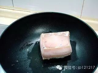 把肉方控净水份,锅中放少许油把肉方煎一遍。