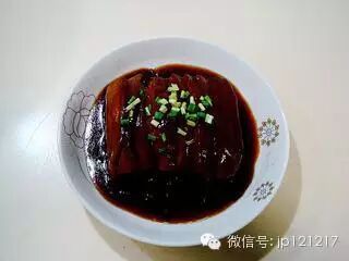 滗出的原汤用水淀粉勾芡,然后浇淋在扣肉上把扣肉稍事点缀便可上桌食用。,。