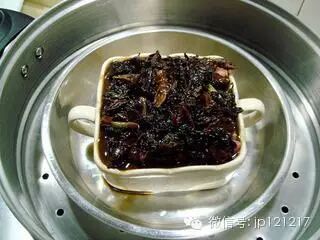 在上面铺上炒好的梅干菜,然后上笼蒸一小时。