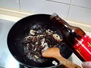 锅中放底油,倒入八角、桂皮、冰糖、葱段、姜片煸炒,炒香后倒入浸泡好的梅干菜翻炒两分钟,然后烹入绍酒炒匀。