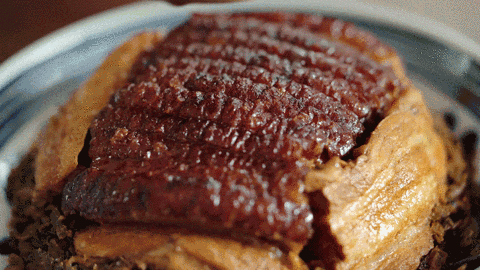 之后入蒸锅,中小火蒸90-120分钟!(如果是微波炉,记得盖上保鲜膜)!蒸完后拿出,面上的八角,和桂叶可以扔掉。把扣肉中的汤汁倒到其他的容器中。