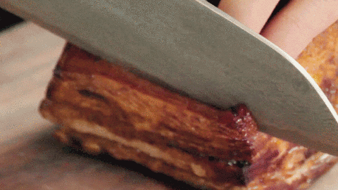 大约炸5.6分钟后(肉表面焦黄色),出锅,大约每片切7.8mm厚!![]()