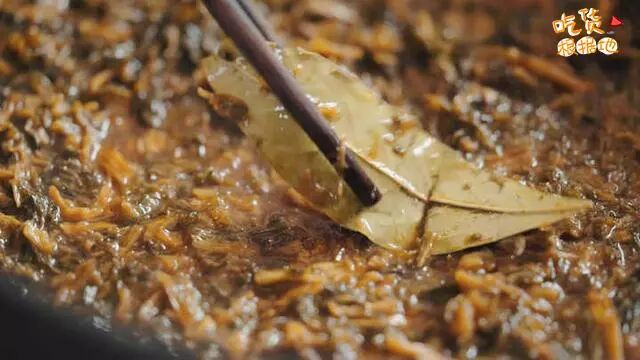 梅干菜用水泡软,泡出沙子!之后晾干,再切碎!热锅烧油,放入姜末,蒜末炒香后,放入梅干菜碎和八角,香叶,再次翻炒!![]()