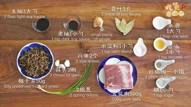材料:带皮三层五花肉1斤,梅干菜1两,葱少许,蒜头少许,香叶少许,八角两个,生姜少许,白胡椒少许,糖少许!,水淀粉少许,米酒适量,生抽适量,老抽少许,香油少许。![]()
