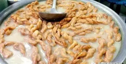 离这家店老远就能闻见油茶麻花的香气,味道咸咸的,他家只卖到中午,想吃的小伙伴可得来早点。是用牛骨髓和面炒制然后熬成的油茶,麻花泡在油茶里,待到绵软后再吃,麻花虽然变软了,但完全不失劲道,油香、面香和着碎碎的芝麻、杏仁、黄豆、花生干果的香味瞬间就让人忍不住的喊饿了。