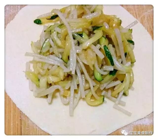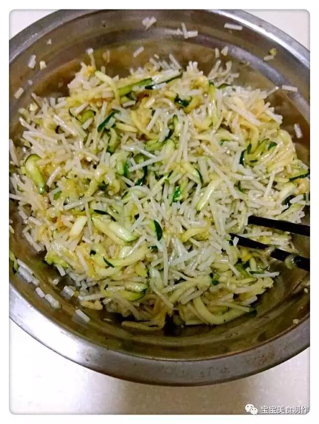 2、嫩南瓜一个去蒂洗净切成丝(要用青皮的嫩南瓜,无需去皮),放入少许的盐拌匀腌十分钟。
