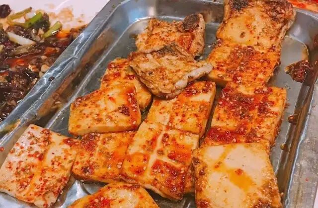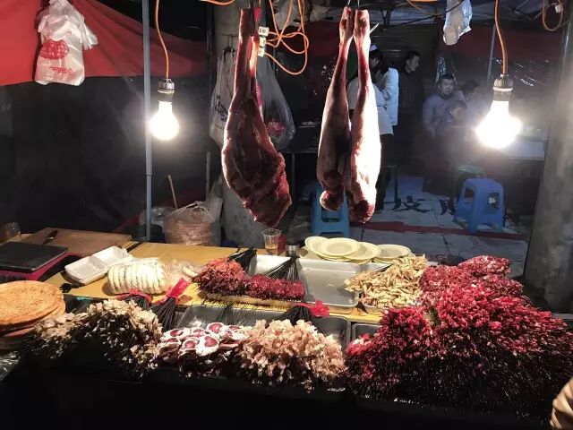 这些烧烤店中的大多数都是在外面支着支着烧烤摊,店主赤膊站在街边来回翻腾着羊肉串,大扇板扑棱扑棱地将烤肉的香气扇出好几里,引得过路人的馋虫直往里坠。