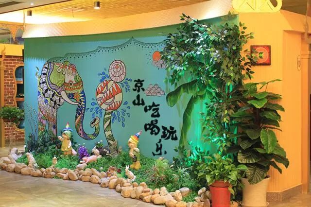 色彩斑斓的灯饰、墙上的吉祥物