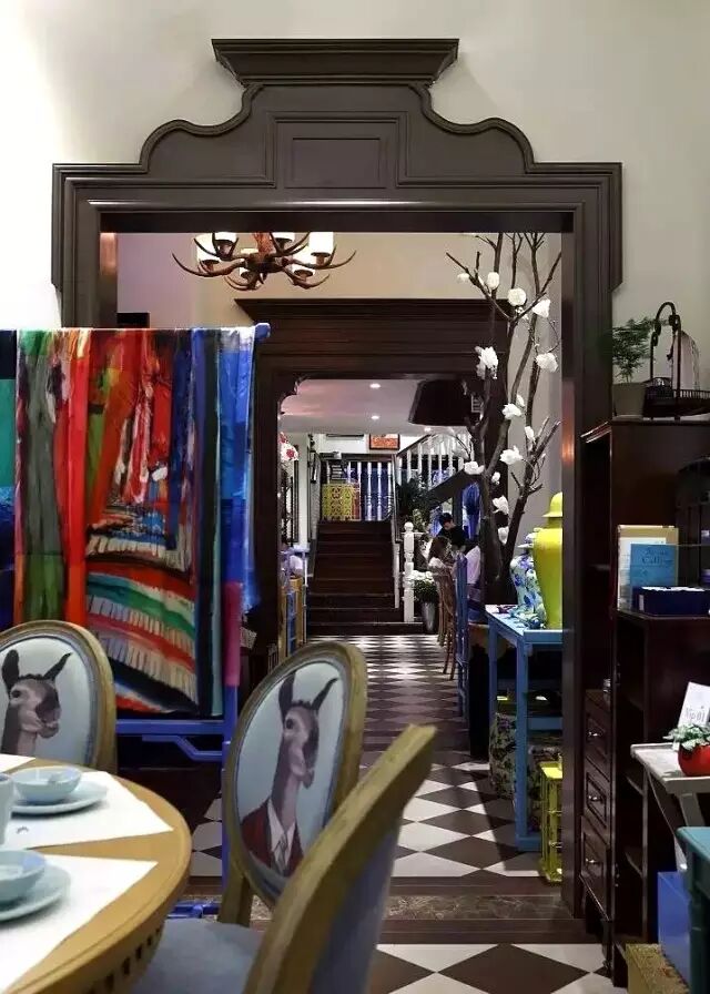 MISS南展现的是一种混合了艺术与生活痕迹的杂货美学,走廊也作为餐区使用,一张张小巧餐桌对应一盏盏复古吊灯,红格桌布十分亮眼。