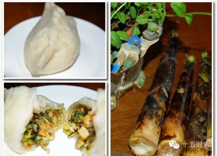 二、再剁馅:香菇、今年新下来的鲜笋飞水,小青菜飞水浸入冰水,分别捞起控水,切碎。粉条飞水,切碎。拌在一起,加适量的盐、香油调味。