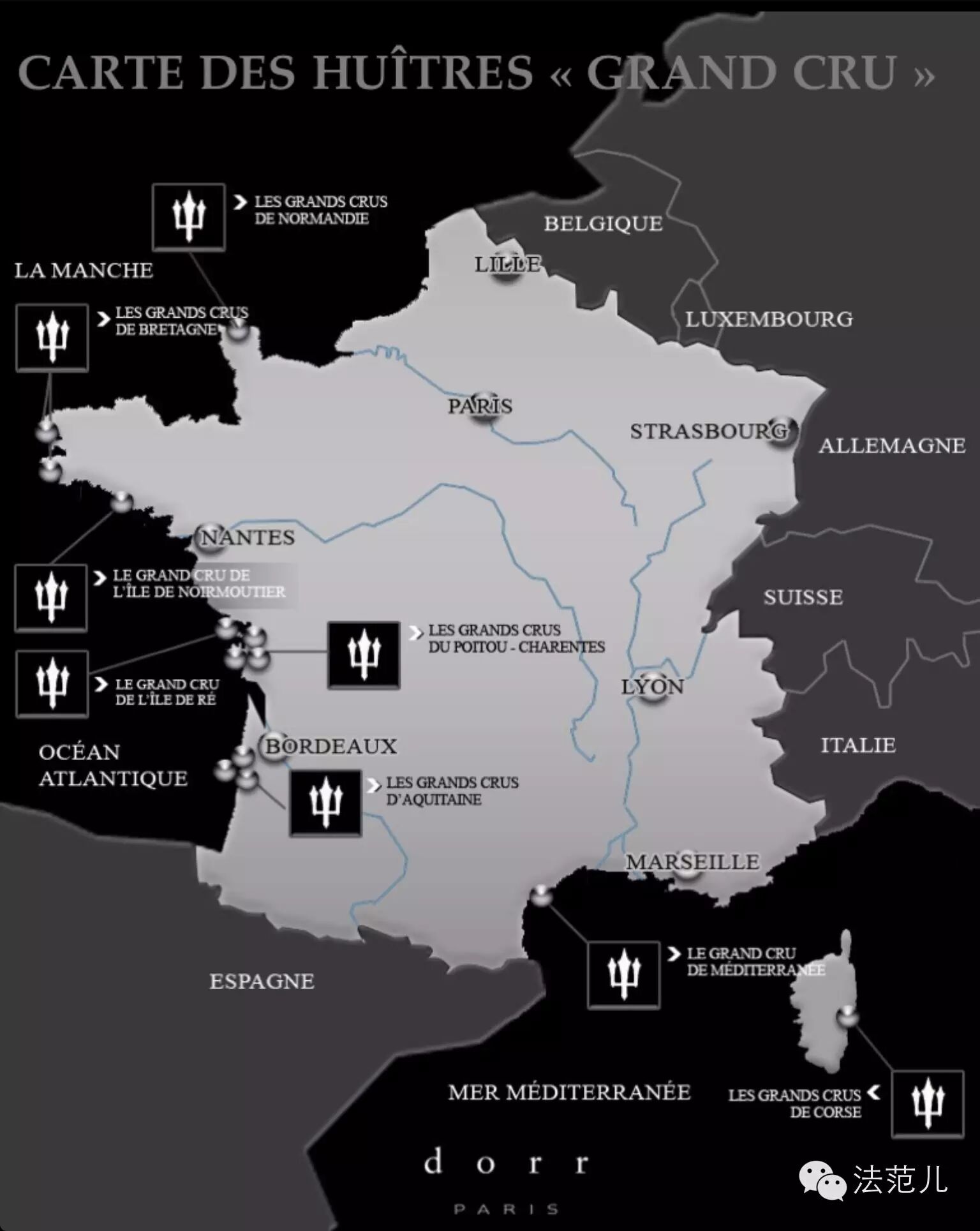 效仿法国的严苛葡萄酒分级制度,2010年,曾师从Alain Ducasse和Joël Robuchon的巴黎海鲜餐厅大鳄Garry Dorr推出了Huîtres Grand Cru 法国生蚝特级产地名单: