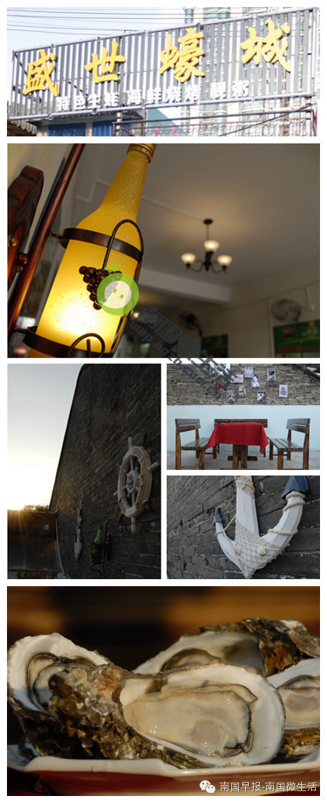 从店面装潢来看,盛世壕城就是一家简单装修的大排档,但是细节上还是能凸显老板的用心。用酒瓶做的壁灯,让人置身于梦幻之中,墙壁上挂着海军风的轮胎和锚,情调就一点点的聚起来了。店铺总面积有400多平方,分为上下两层,可同时容纳上百人聚餐。小南南比较偏爱二楼的露台,晚上可以约上友仔,一边吃生蚝一边看车流夜灯,看星星看月亮,谈人生谈理想,从诗词歌赋谈到宇宙哲学,小南南仔细一想,这真真是极好滴~