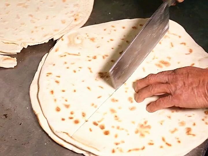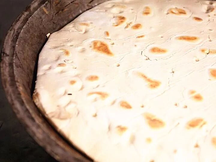 要想饼筋道除了和面时要加入碱,还要反复揉面均匀上劲。面团擀成厚薄均匀的面片,拿刀轻轻划上一圈,一个圆形的饼就出现了。放到一旁的鏊子上小火慢焙,烙到一面有褐色的馍花出现,就翻起烙另一面。