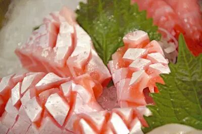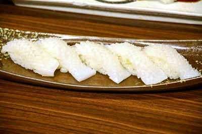 而鱿鱼的寿司就更有意思啦,极其考验师傅刀工的鱿鱼,将它片成薄片开刀花,这样的处理,不仅寿司造型好看,而且这样的处理会让韧口的鱿鱼变得更易咬断,爽口又弹牙!