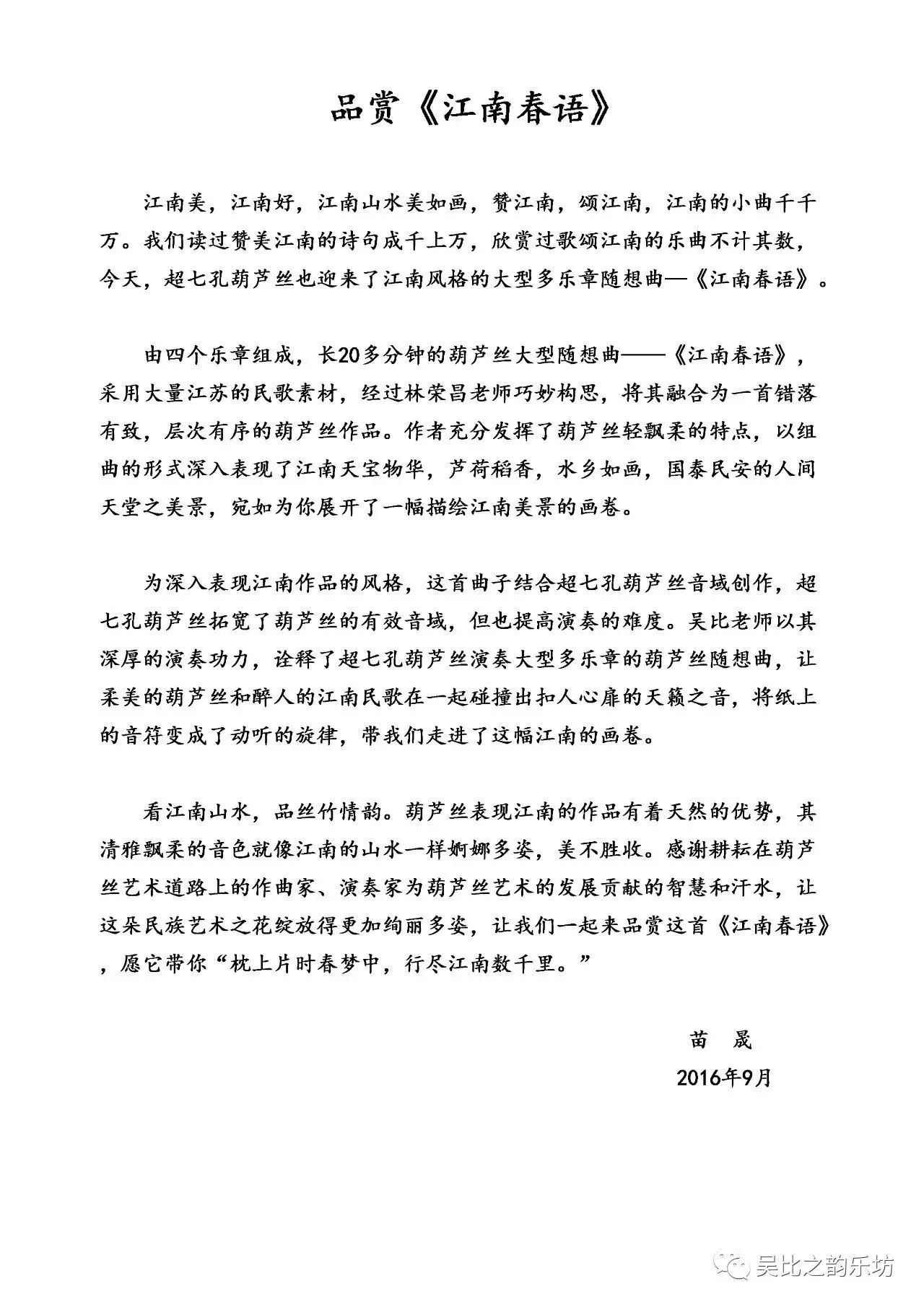 江南美,江南好,江南山水美如画,赞江南,颂江南,江南的小曲千千万。我们读过赞美江南的诗句成千上万,欣赏过歌颂江南的乐曲不计其数,今天,超七孔葫芦丝也迎来了江南风格的大型多乐章随想曲—《江南春语》。