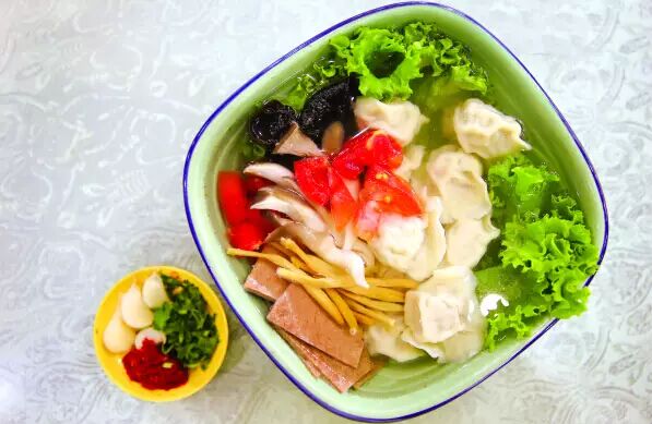 汤饺馅也颇有考究,配方不对外公开,而汤料中的生菜、木耳、西红柿、黄花等,五色搭配,不光是五颜六色,同时也做到了营养均衡。