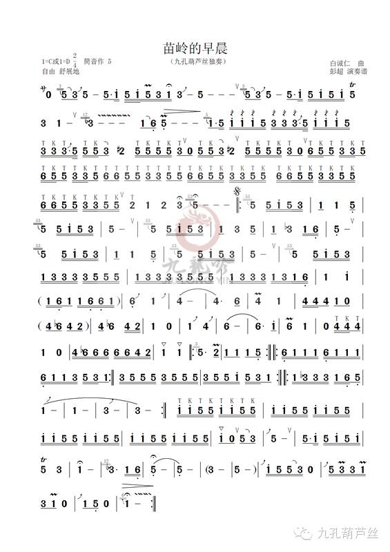 彭超老师根据白诚仁的口笛独奏曲改编成了一首“九孔葫芦丝”独奏曲,其素材也是取自贵州黔东南苗族飞歌的音调,具有苗族飞歌优美质朴、高亢、委婉的特点,诠释苗族人民乐观开朗、热情豪放的民族性格是一次全新的尝试。