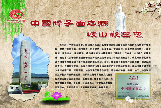 2016年初,岐山县被中国烹饪协会授予“中国臊子面之乡”荣誉称号。这张金灿灿的“国字号”名片,不仅是岐山县不断加快推进臊子面品牌化、产业化、市场化发展的真实写照,还饱含着岐山人对臊子面发展的无限期望。