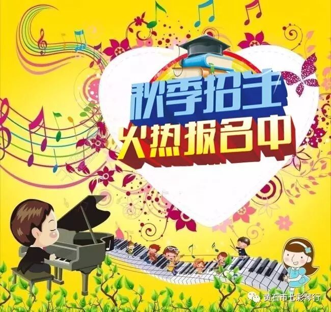 七彩虹艺校盛大招生学校简介 七彩虹艺术培训学校是黄石教育局注册认证的专业艺术培训机构,七彩虹艺术培训学校携手国际音乐教育品牌雅马哈与美国儿童艺术教育品牌戴纳索斯,强强联合打造的教学全国连锁培训机构----雅马哈·戴纳索斯国际钢琴教室,引进国际先进的音乐教学体系。七彩虹艺术培训学校秉承“推广音乐文化,培育音乐人才”的教育理念,为不同年龄、不同需求的音乐爱好者,订制适合、有效的教学方案,致力推动音乐教育事业在中国普及和推广,打造黄石专业艺术品牌! 七彩虹总校和分校荟萃了全区艺术各专业优秀教师在我校任教。教学内容七彩琴行 ·七彩虹艺术学校开设专业:键盘乐:钢琴、电子琴、数码钢琴、管弦乐:萨克斯、单簧管、长笛、小提琴、民 乐:古筝、竹笛、古琴电声乐:民谣吉他、古典吉他、电吉他、贝司声 乐:少儿歌唱、成人声乐、打击乐:架子鼓音乐理论:音乐素养、视唱练耳、假期班:寒暑期各专业集训、短期集训、各专业一对一课程七彩琴行经销:经营范围:钢琴、电钢、电子琴、萨克斯、单簧管、吉它、贝司、长笛、架子鼓、小提琴、古筝、二胡、葫芦丝等乐器七彩虹艺校成果展示超大展厅,您想要的乐器这里都有...黄石七彩琴行总店(雅马哈钢琴专卖店)、黄石七彩琴行旗舰店为雅马哈钢琴黄石地区唯一官方授权代理商。厂家授权珠江钢琴、敦煌古筝黄石地区特约经销商!七彩琴行店面地址雅马哈钢琴专卖店(七彩琴行总店)地址:黄石市广场路9号(中医院对面)电话:0714-6264488七彩琴行旗舰店(大上海分店)地址:黄石市武汉路大上海广场A区4-103#(秀玉一楼)电话:17371412053七彩虹艺术培训学校(广场路总校)地址:黄石市广场路9号(中医院对面)电话:0714-6264488七彩虹艺术培训学校(大上海分校)地址:黄石市武汉路大上海广场A区4-103#(秀玉一楼)电话:0714-6204499雅马哈·戴纳索斯国际钢琴学校地址:黄石市武汉路大上海广场A区4-103#(秀玉一楼)电话:17371412035