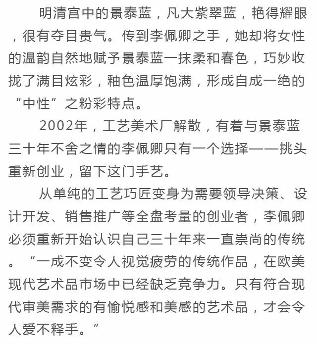 作为“京作御用”、“燕京八绝”之一的景泰蓝,被认为是国人心中的国器,端庄尊贵华丽,又有些程式的老道。而李佩卿手里的景泰蓝,却如万般贵气中脱颖出的一缕飘逸浪漫,还带着些不落俗套的欧洲风。