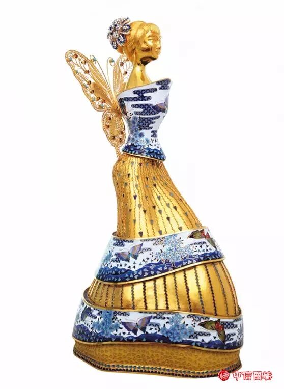 李佩卿并没因此满足,她又在另一新作《蝶舞》中,首度将“燕京八绝”中景泰蓝与花丝镶嵌“二绝”完美结合,成功塑造出一个将金色凤蝶花丝镶嵌与典雅的青花蓝釉完美融合于一身的女性飞扬造型。《蝶舞》整体造型简练、新颖,典雅、亮丽。女性造型身披金丝彩翼,周身的景泰蓝装饰带采用青花瓷效果,大面积的金色与白色、蓝色碰撞,形成强烈对比,清逸而雅致。整件作品灵动优美,端庄高贵,象征着飞向和谐幸福的生活,也展示出当代景泰蓝创作之新工艺。