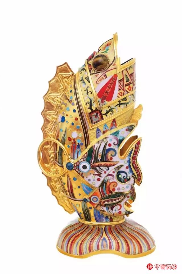 《鱼韵》则在创新层面走得更远,李佩卿首度在作品中采用粉彩景泰蓝,以高堆釉的独到工法,结合镂金、点蓝、扭花丝等工艺,用哥德式建筑、梵高油画以及巴黎埃菲尔铁塔等象征欧洲文化的艺术符号,彩绘出一个梦幻般的海底世界。因此被国际展会评委团评为是一件“从未看过手感如此强烈并如此美丽的艺术作品”,还破例为李佩卿研制的粉彩景泰蓝釉料颁以发明银奖。