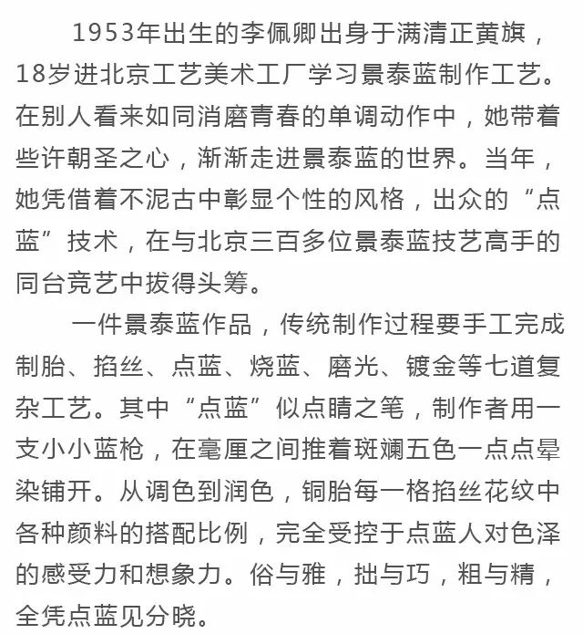与景泰蓝艳丽典雅的皇家气质相比,她的创作者,显得内敛而朴实。大家闺秀的端庄和经得起岁月的娟丽,秀外慧中。