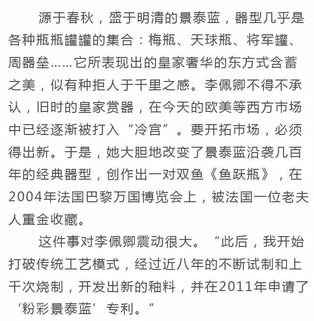 李佩卿成功的关键在于她承古纳新,既保留了景泰蓝传统工艺的特点,又以出神入化的想象力大胆突破,不断融入新锐设计理念,并向更多姊妹工艺延伸。她在《富贵有余》、《祥龙晋宝》等作品中以“二绝”为基础,又融入玉雕、漆雕、金漆镶嵌等多“绝”工艺,不断尝试着多种工艺的融合与跨界。