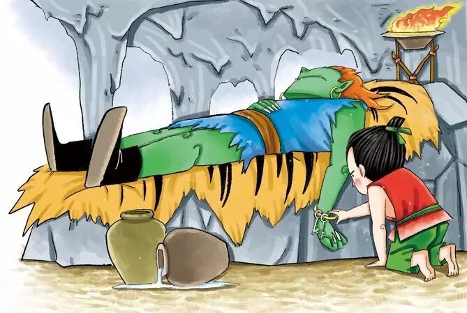 正在这时,绿脸妖怪醒了,他看见了葫芦娃,气得大叫起来:“你这个小东西,竟敢偷我的钥匙!”说完,绿脸妖怪左扑右扑,怎么也抓不到葫芦娃。