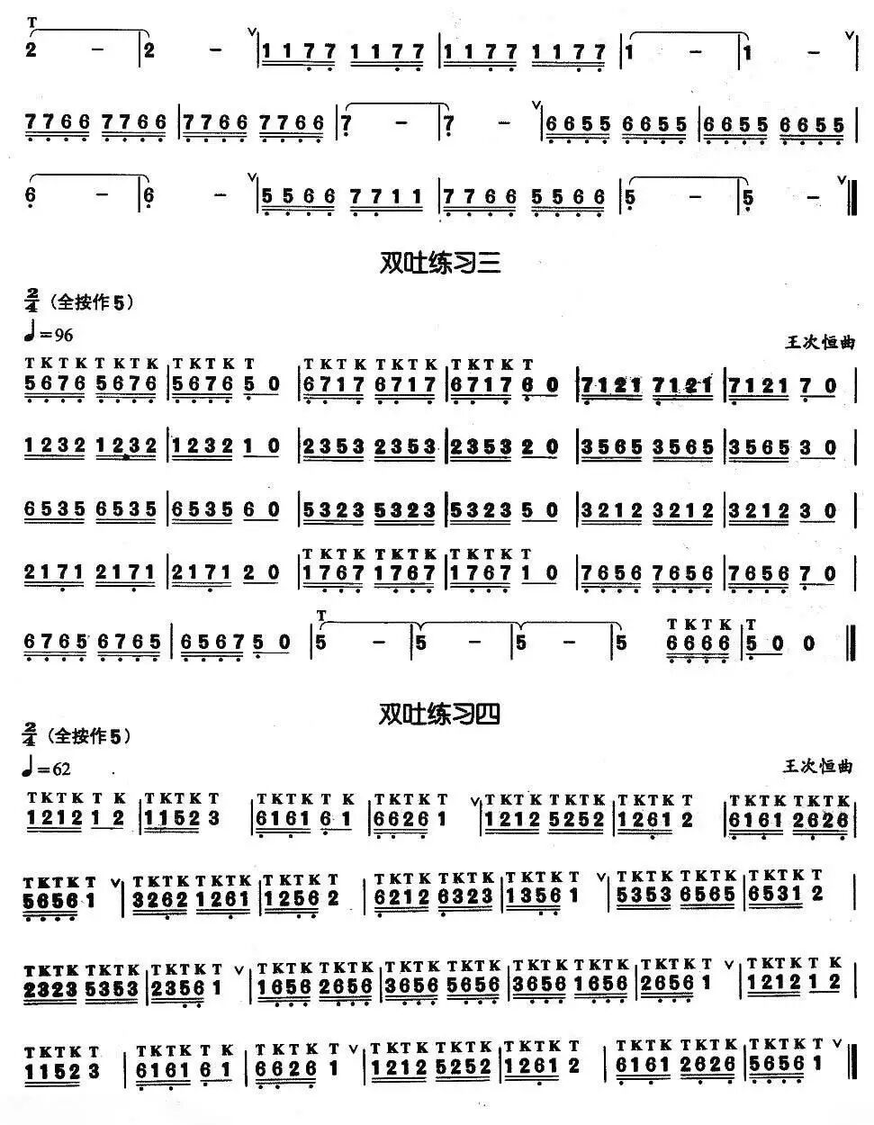 双吐是用来完成连续快速分奏的技巧,双吐的训练有一定的难度,需要一段时间的练习才能到位,开始可单独练习舌头,把T和K的发音连起来练习。在乐器上练习时先慢练,舌头和手指配合好,初学者主要问题是吐轻苦重,当发到苦时会软下来,苦的发音含糊不清,练习时应加强苦的练。