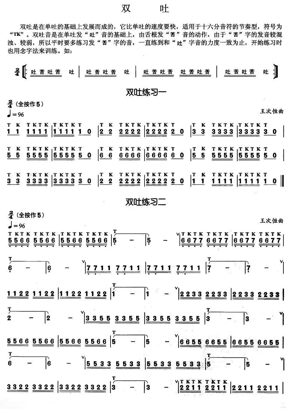 双吐是在单吐的基础上在加上一个“苦”字即“吐苦”,利用舌尖和舌根的连续动作使音快速断开,双吐一般用“TK”来标记。