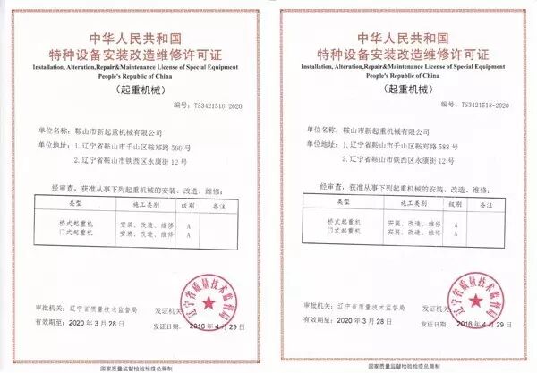 我公司通过ISO9001质量体系认证。产品广泛应用工厂、矿山、冶金、化工、电力、货场、码头、建设施工等场合。鞍山市新起重机械有限公司将以优质的产品,良好的企业信誉,完善的售后服务,竭诚为广大用户提供安全、稳定、高效的优质产品。